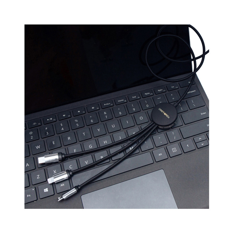 Illuminating 120cm Type-C charging cable with dual input USB-A and Type-C and triple output Type-C, Micro-B USB, and Lightning. Lumos features a built-in LED that illuminates the engraved branding when in use, and the braided cable increases durability.