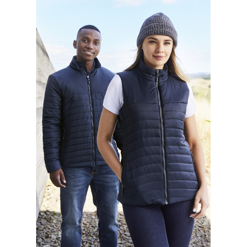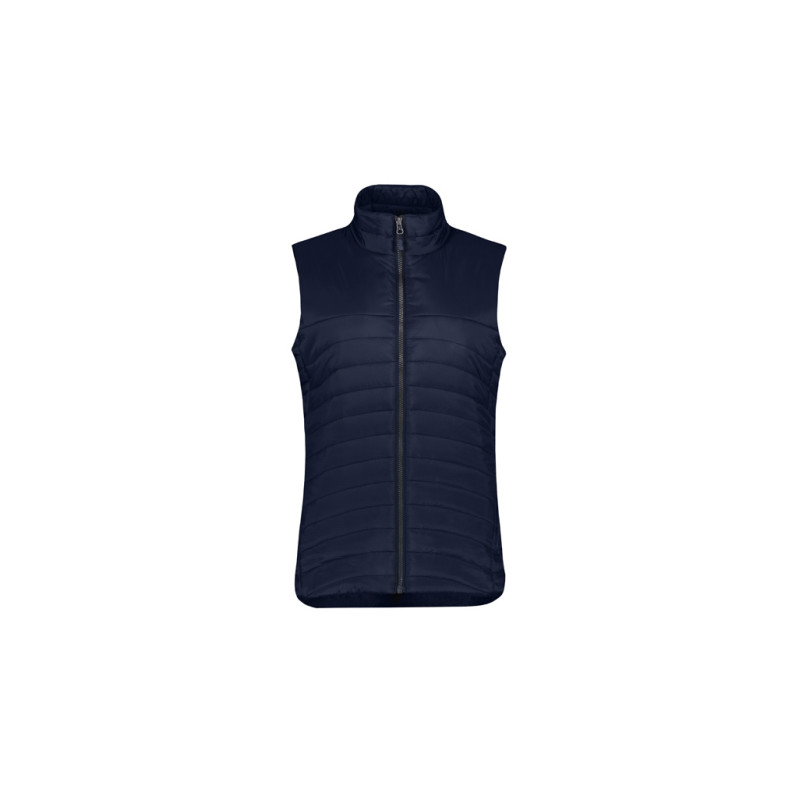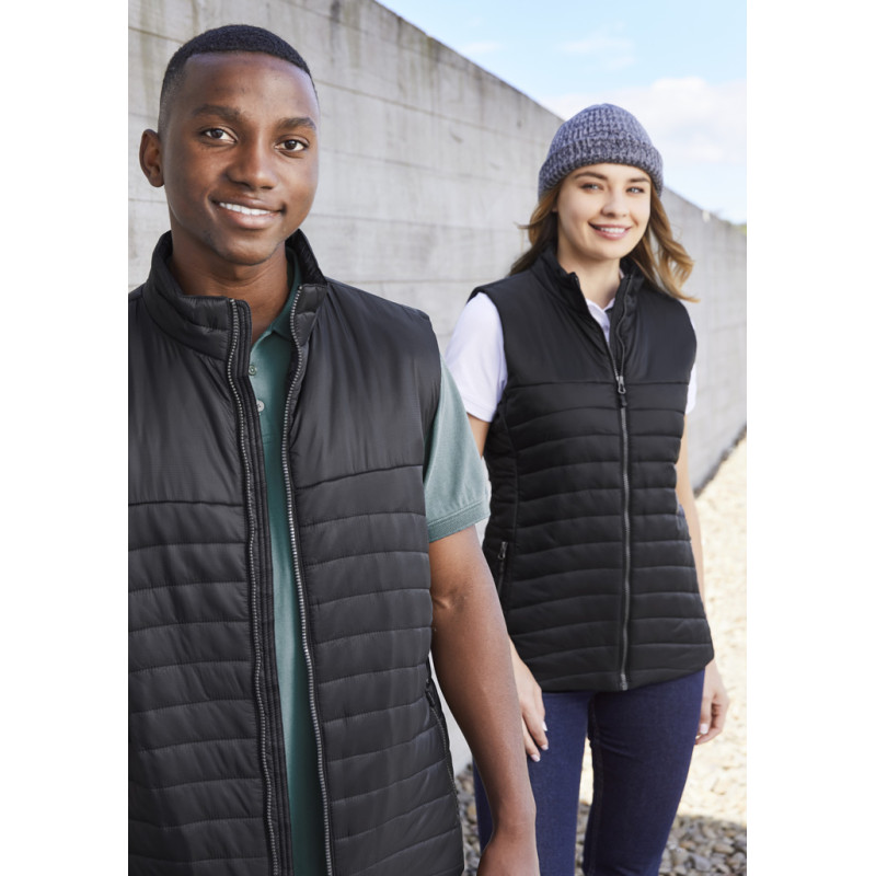 Water repellent unisex padded vest with water proof zippers, elastic drawstring at bottom hem and top of collar. Fleece in pockets and inside collar. Two zipped inner pockets, one with cord opening. The yoke can be opened for ease of decoration. Fleece in pockets and inside collar.|Two zipped inner pockets, one with cord opening.|The yoke can be opened...