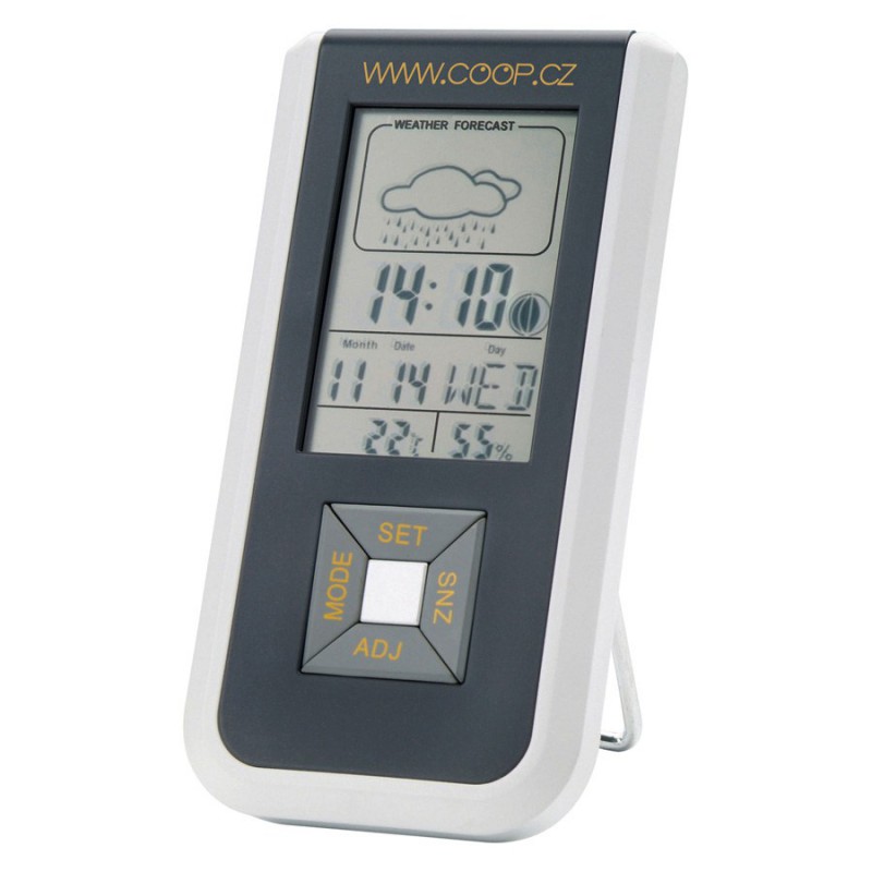 With removable metal back stand. Featuring weather forecast, time in 12/24 format, alarm clock with snooze function, moon phase, date, day, year, temperature in C/F format and humidity.