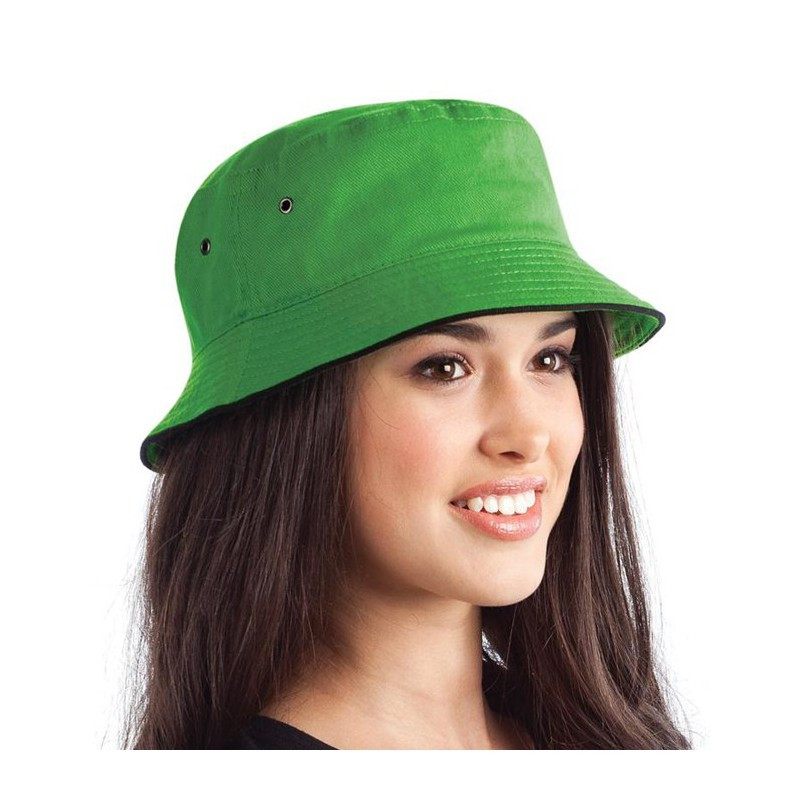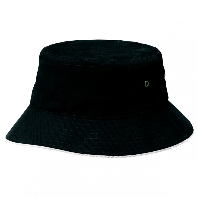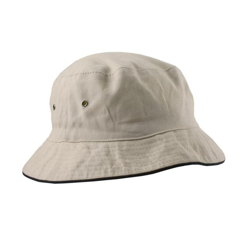 Premium heavy brushed cotton bucket hat with stylish white sandwich trim around the base. It has a sweat band and is available in three sizes.
