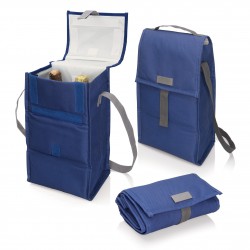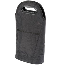 Premium two-bottle wine carry bag which keeps wine cool while in transit. It is manufactured from 600D polyester with PE foam insulation encased in a water-resistant PEVA inner liner. Other features include strong woven carry handles, a zippered front pocket and a zippered main compartment with dome closures to lock the ends away neatly.