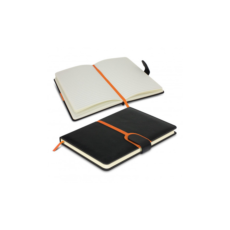 A large-size notebook that has a hardcover with a smart PU finish. It has 96 sheets (192 pages) of 70gsm lined paper, a bookmark ribbon, an elastic closure band and an elastic pen loop.