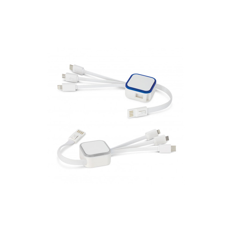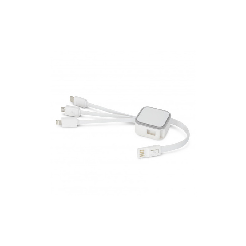 Stylish retractable triple connector cable which is effectively three cables in one and will work with most smart phones. It has a USB plug on one end with a Micro-B connector, a Lightning connector and a USB Type-C connector on the other. This cable is for charging only and is not designed for data connections.