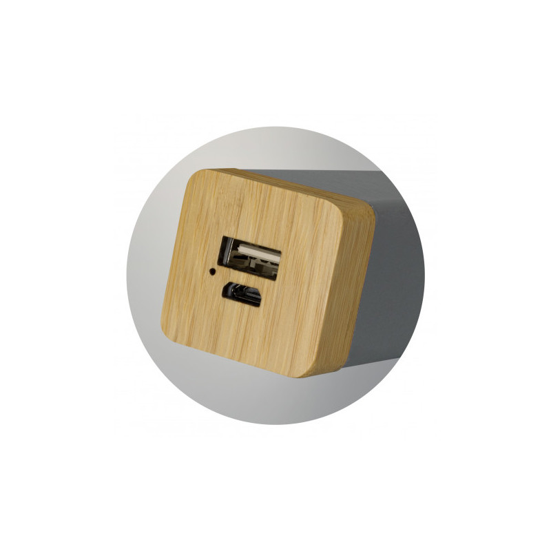 Wireless 5W phone charger with a sleek natural bamboo finish. It will charge devices that are enabled for wireless charging and will work with most modern phones. Simply plug it into any USB port or a mains adapter and place a compatible device on it for convenient wireless charging. The charger is presented in a kraft gift box with a Micro-B USB cable...