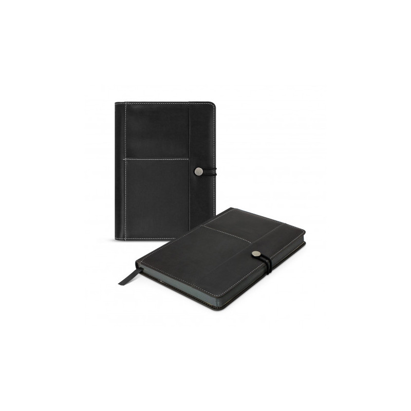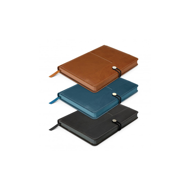 A large-size notebook that has a hardcover with a smart PU finish. It has 96 sheets (192 pages) of 70gsm lined paper, a bookmark ribbon, an elastic closure band and an elastic pen loop.