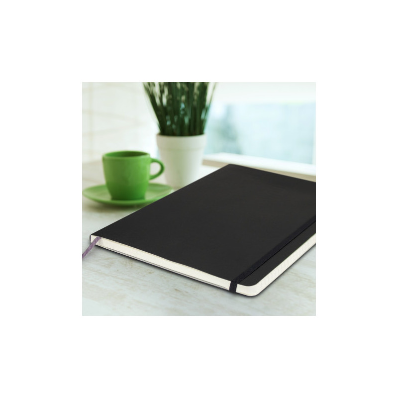 A large-size notebook that has a hardcover with a smart PU finish. It has 96 sheets (192 pages) of 70gsm lined paper, a bookmark ribbon, an elastic closure band and an elastic pen loop.