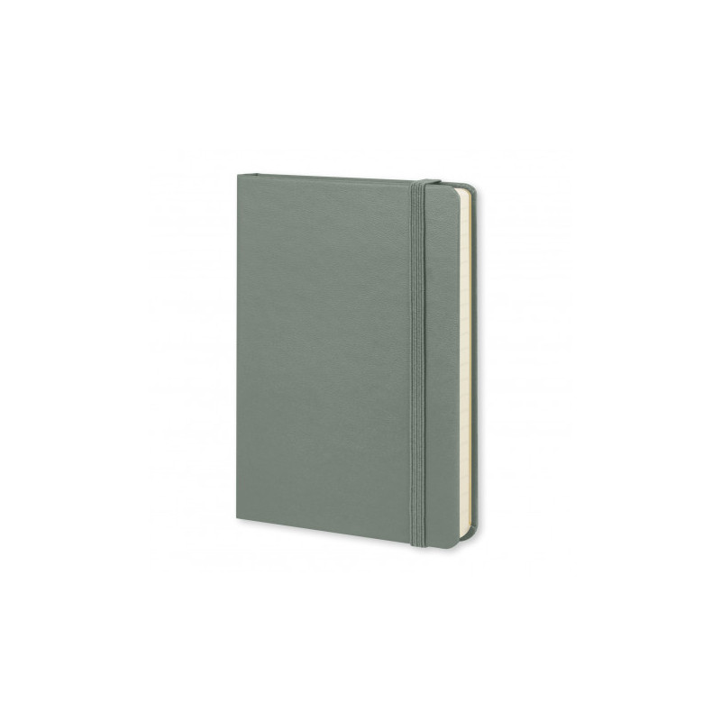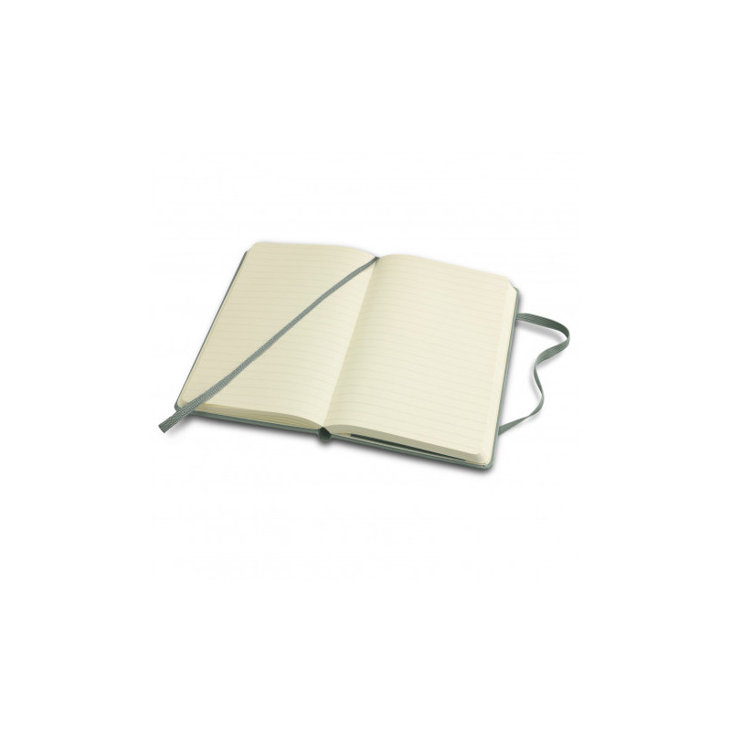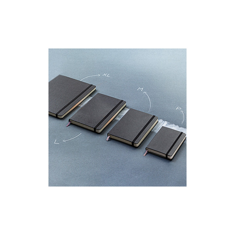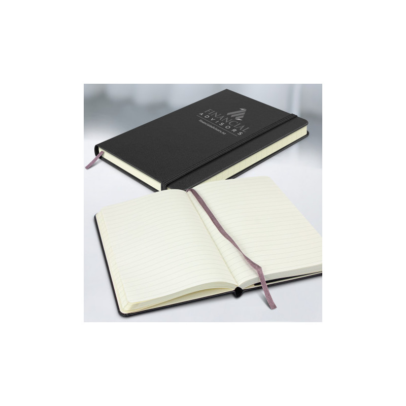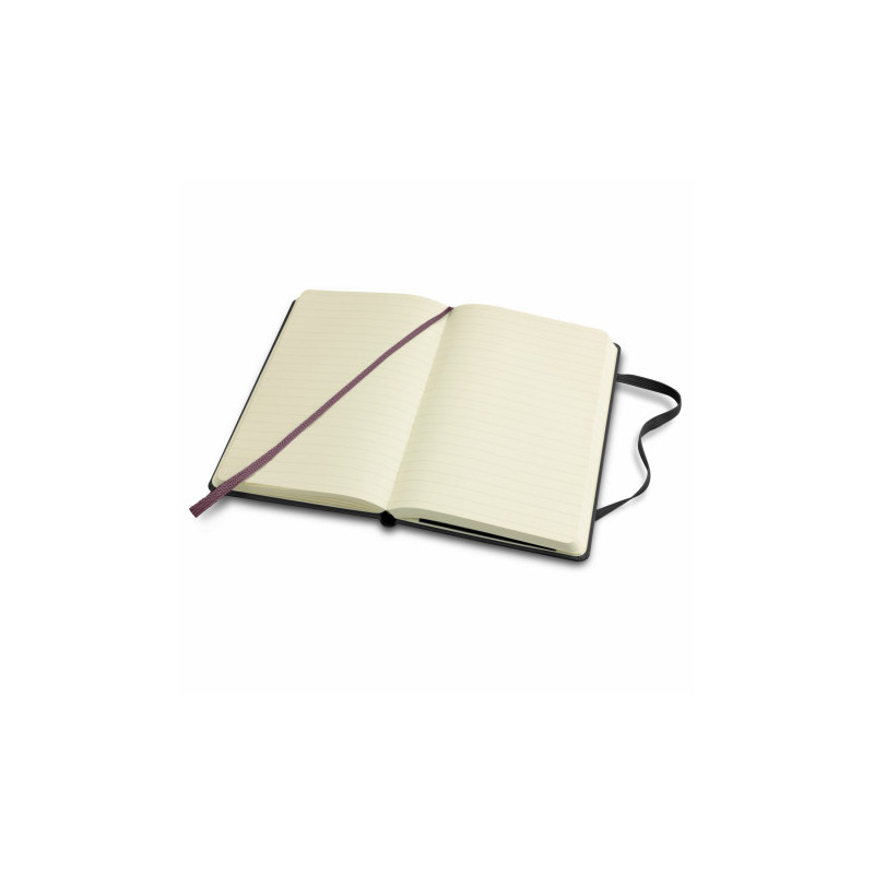 A large-size notebook that has a hardcover with a smart PU finish. It has 96 sheets (192 pages) of 70gsm lined paper, a bookmark ribbon, an elastic closure band and an elastic pen loop.