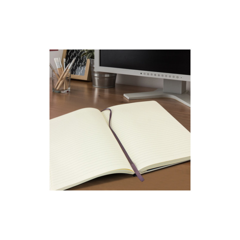 A large-size notebook that has a hardcover with a smart PU finish. It has 96 sheets (192 pages) of 70gsm lined paper, a bookmark ribbon, an elastic closure band and an elastic pen loop.