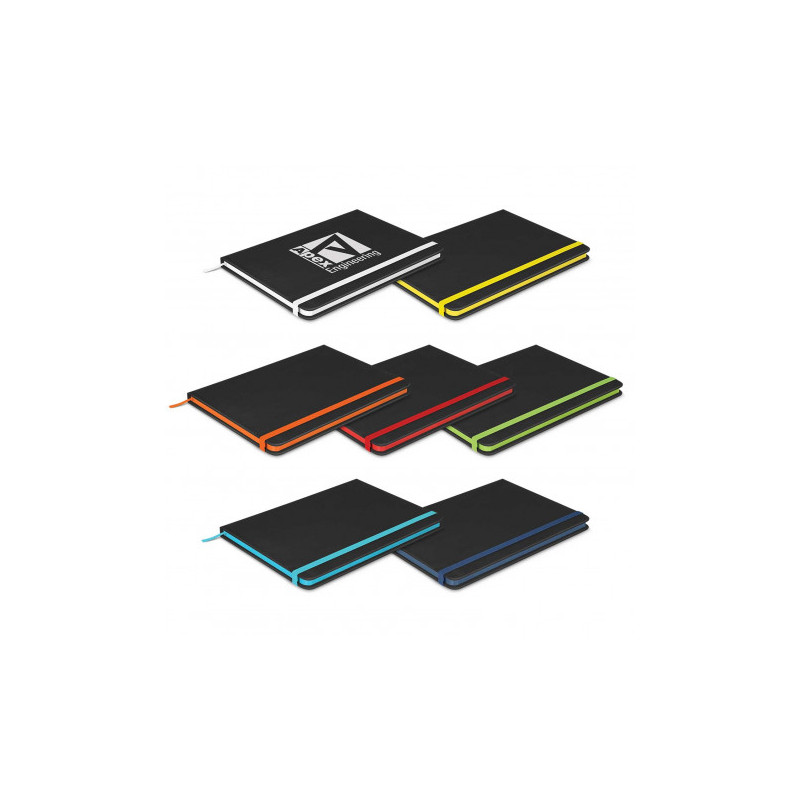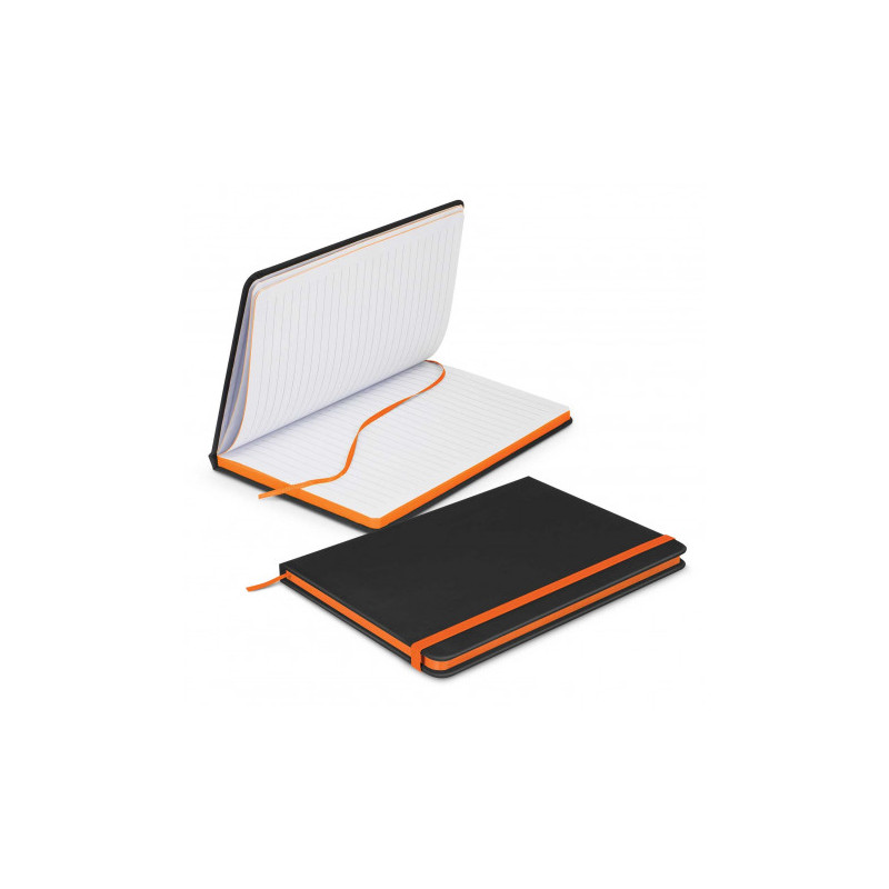 A large-size notebook that has a hardcover with a smart PU finish. It has 96 sheets (192 pages) of 70gsm lined paper, a bookmark ribbon, an elastic closure band and an elastic pen loop.