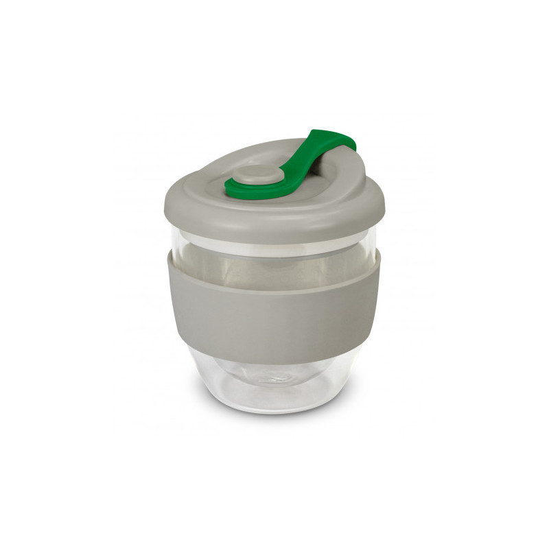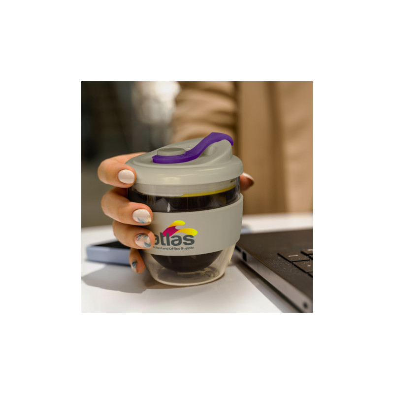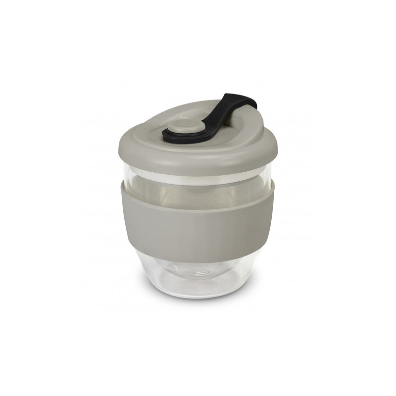 Exquisite 350ml double wall borosilicate glass coffee cup with a secure push-on polypropylene lid with silicone swivel closure and a wide heat-resistant silicone band. Borosilicate glass is incredibly light and very strong. The double wall construction keeps drinks hot for longer while the outside of the glass remains comfortable to hold. The silicone...