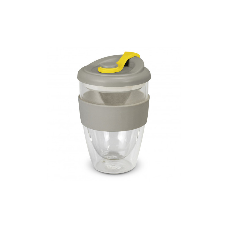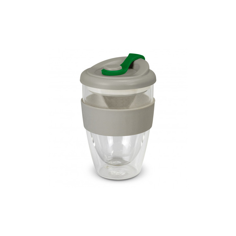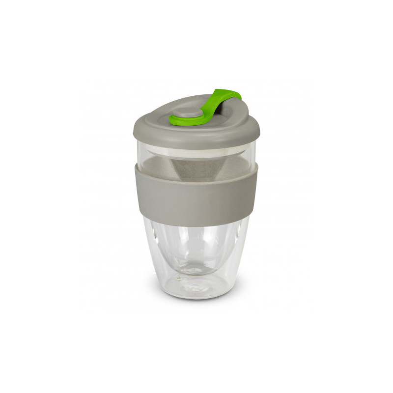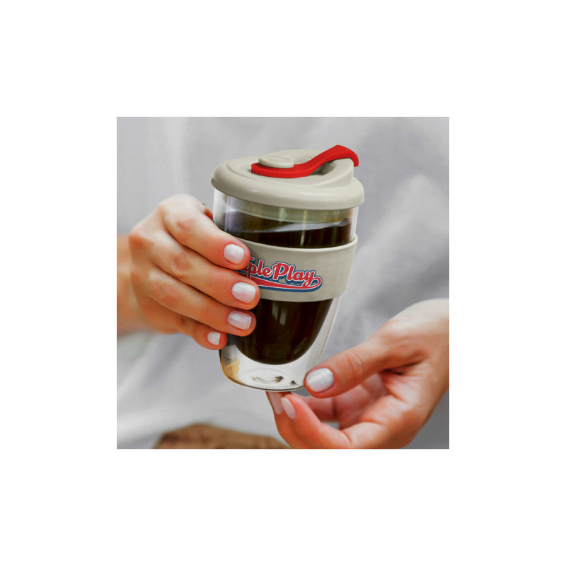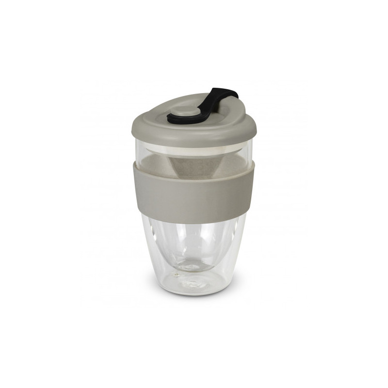 Exquisite 230ml double wall borosilicate glass coffee cup with a secure push-on polypropylene lid with silicone swivel closure and a wide heat-resistant silicone band. Borosilicate glass is incredibly light and very strong. The double wall construction keeps drinks hot for longer while the outside of the glass remains comfortable to hold. The silicone...