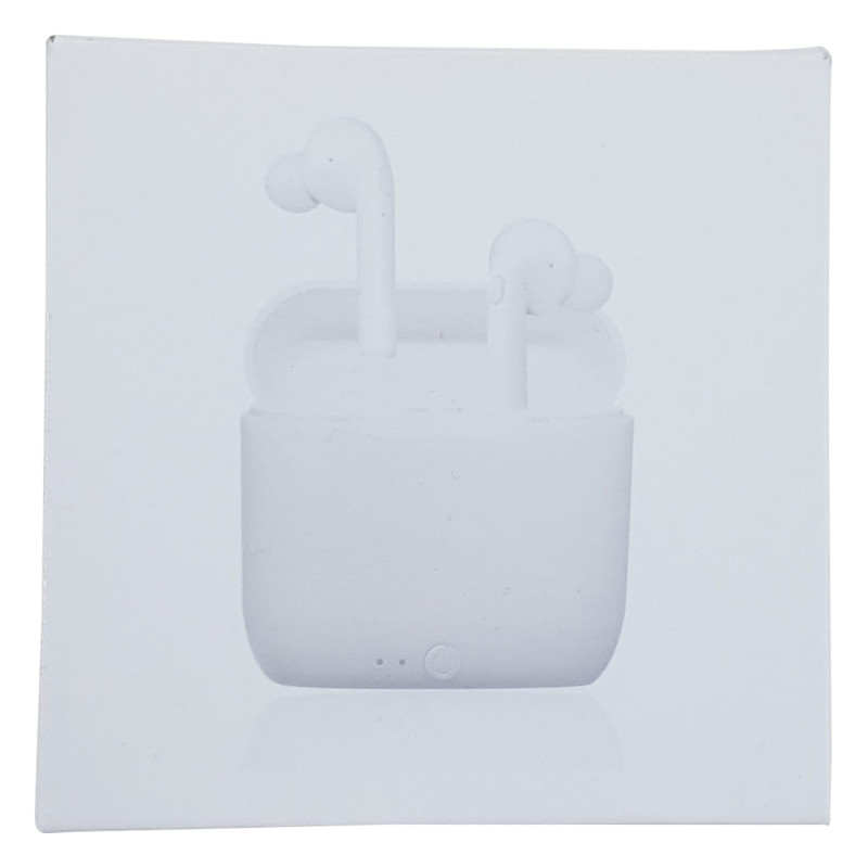 TWS earbuds in charging case. Each set contains 3 different size silicone buds for correct fit. Micro USB cable for charging included. 400mAh battery in charge case. Earbuds have 50mAh battery, approx 3 hours listening time. ABS case and buds