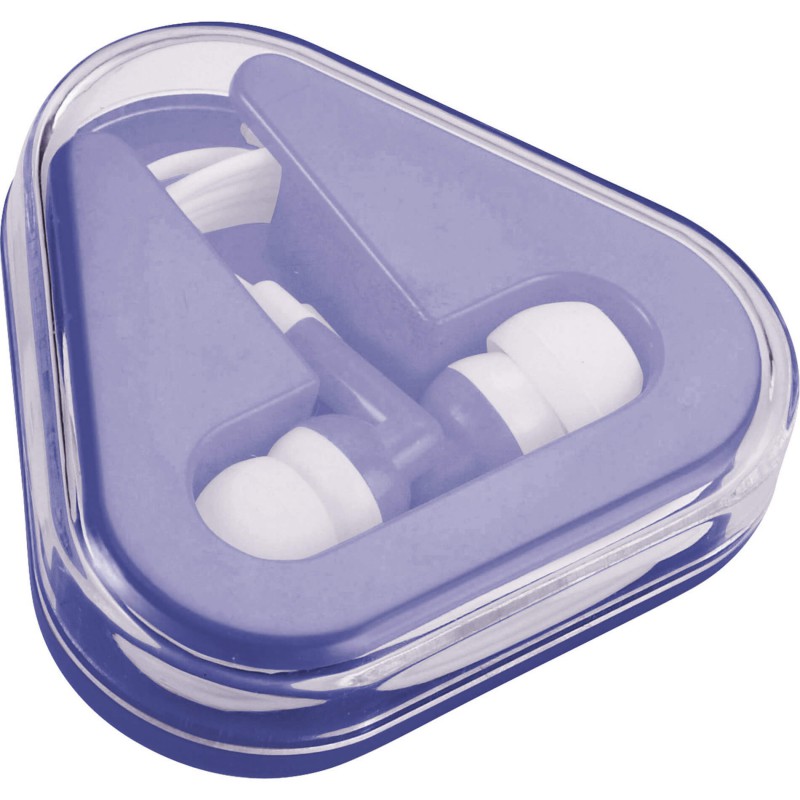 Earbud set in round pocket sized plastic carry case. Fits most phones and media players. 1.2m lead with 3.5mm audio jack. Case and earbud housing are matching colours.