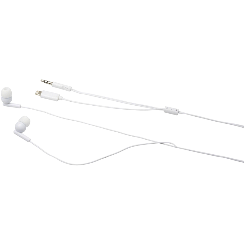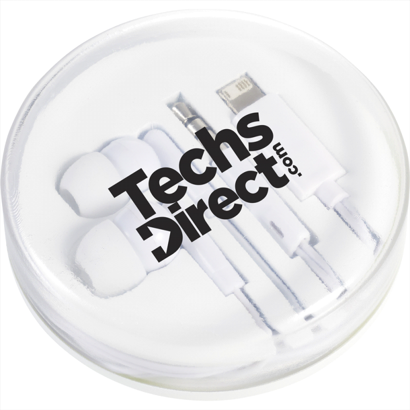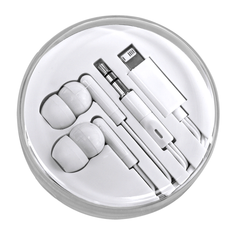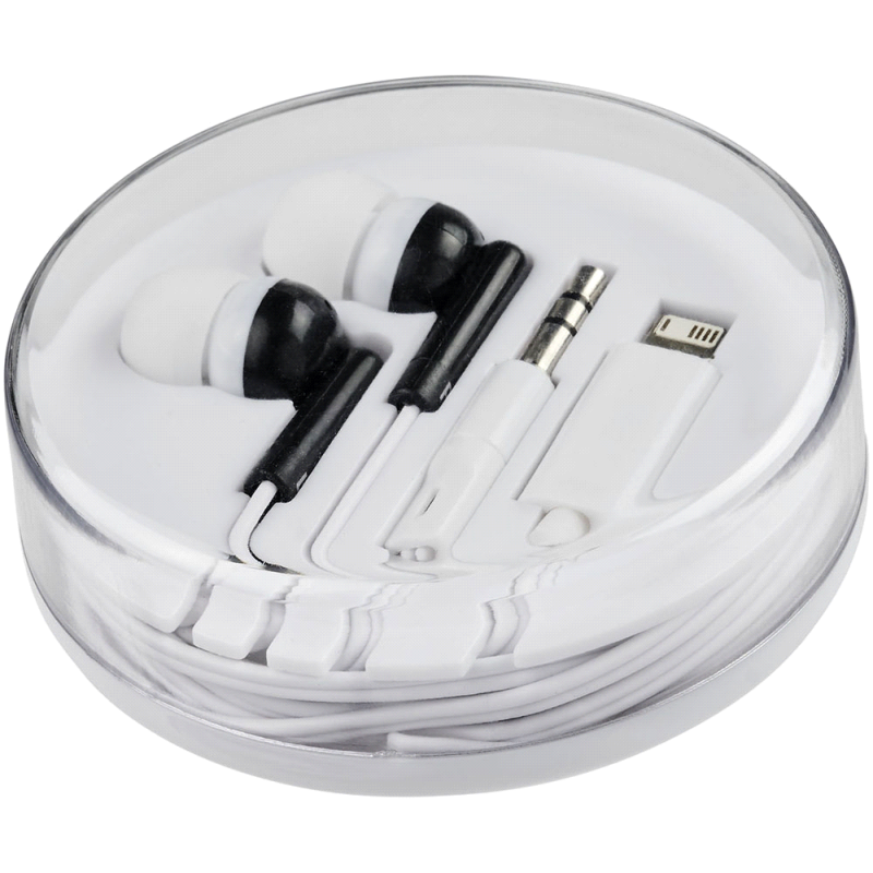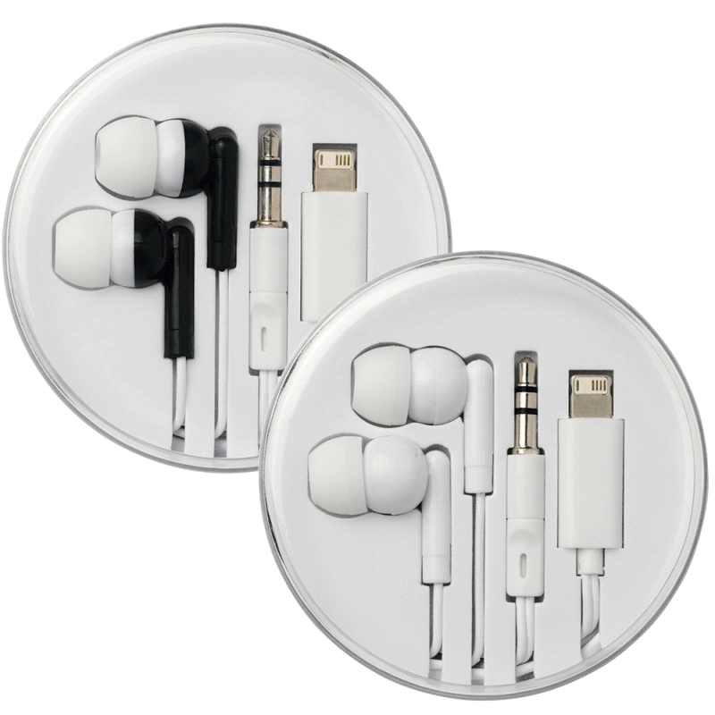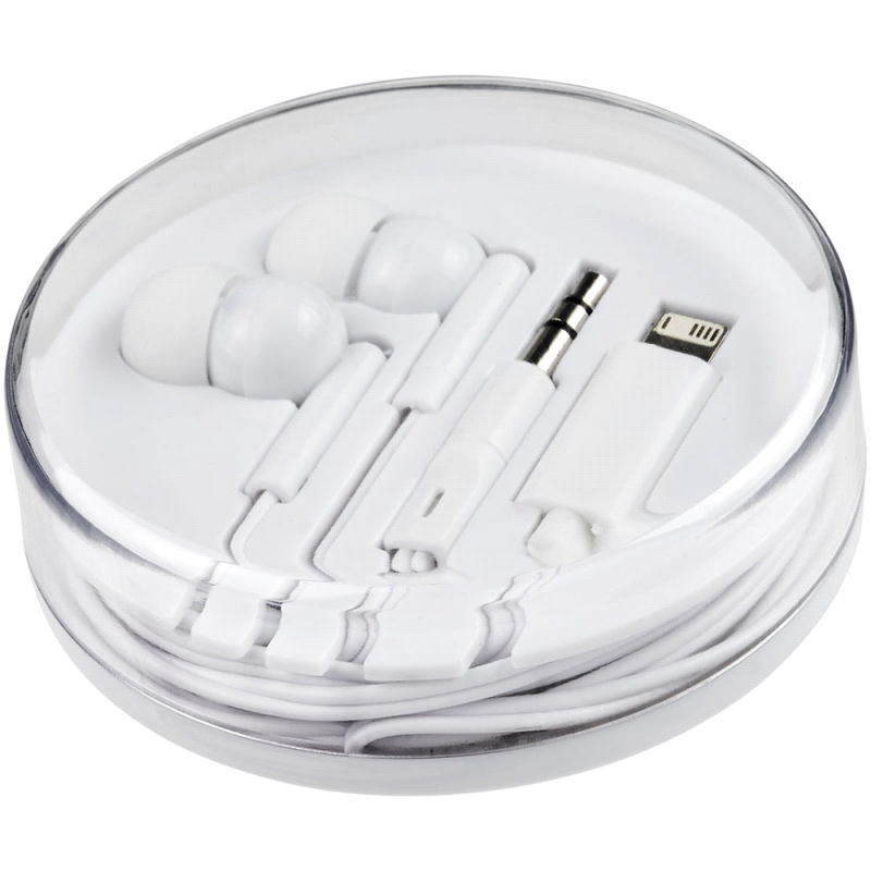 Earbud set in round EVA zippered case. Fits most phones and media players. 1.2m lead with 3.5mm audio jack.