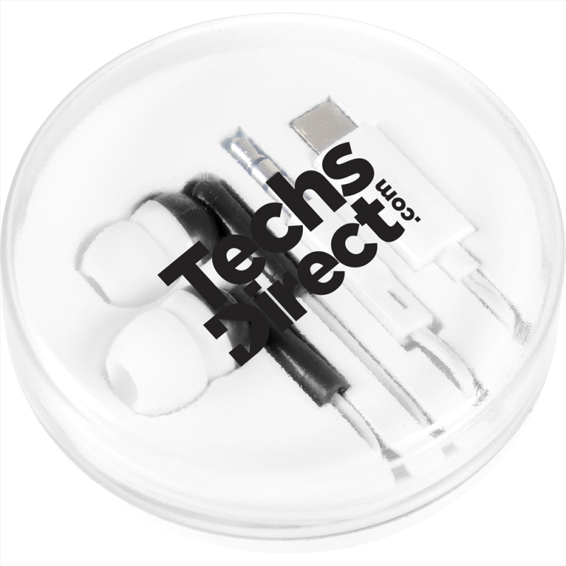 Earbud set in round pocket sized plastic carry case. Fits most phones and media players. 1.2m lead with 3.5mm audio jack. Case and earbud housing are matching colours.