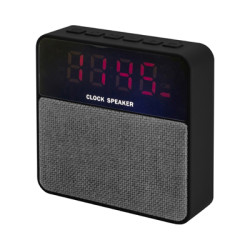 Stylish high fidelity wireless Bluetooth speaker with clock display. This ideal desktop accessory provides a 3 watt output, auxiliary line input, hands-free function, TF card player, auto search FM radio and alarm clock radio. Includes combined USB charge, auxiliary and antenna cable, rechargeable lithium battery and user manual. Materials: ABS...