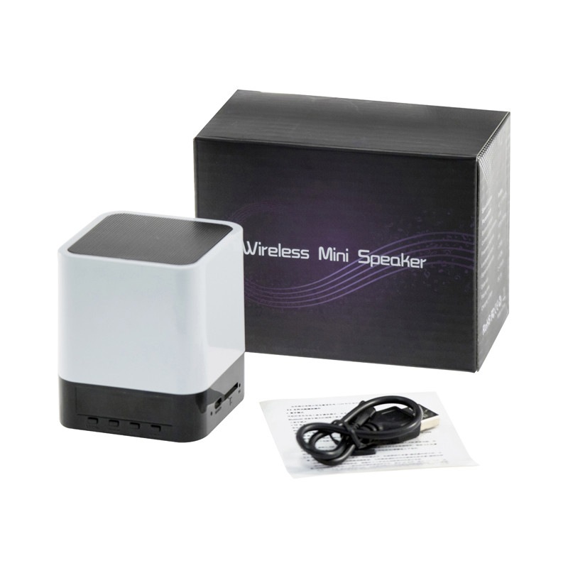 This compact Mini Cube Bluetooth speaker delivers high fidelity sound! Available with a 3 position light-up logo or printed branding options, the Mini Cube will undoubtedly be noticed. Comparing favourably in the sound department with other 3 watt speakers, the Mini Cube with its external loop and carabiner is an ideal travel partner. Includes micro USB...