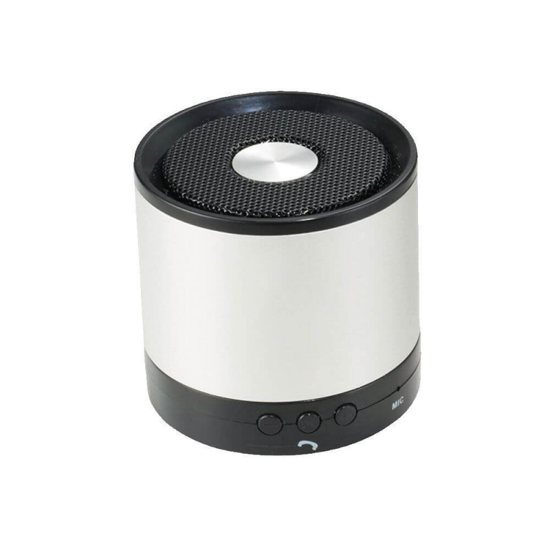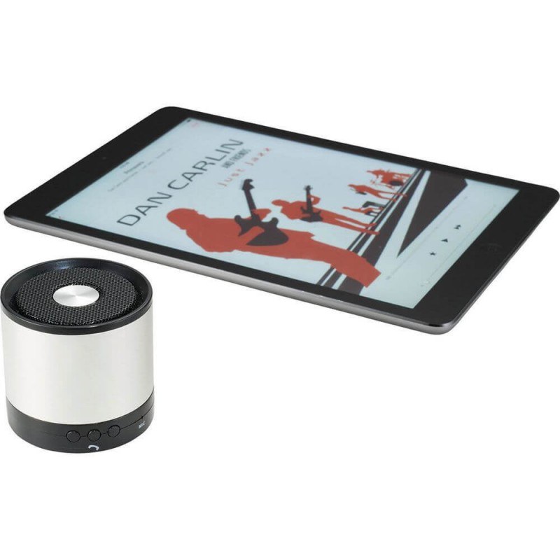 Bluetooth speaker with contrasting aluminium alloy case, auxiliary line input to allows access to smartphones, PC and notebook, built-in 400 mAh Lithium-ion battery, hands-free function, LED power and charge indicators. TF card reader (optional extra cost). Includes 3.5 mm audio cable, USB charge cable and user manual. Material: Aluminium, ABS...