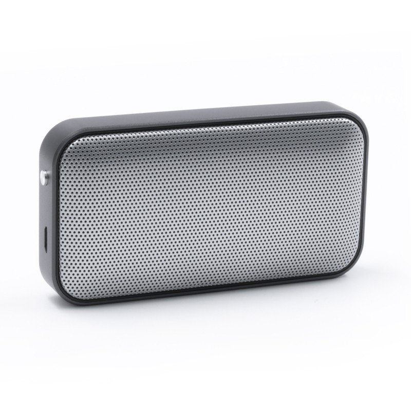 Bluetooth speaker with contrasting aluminium alloy case, auxiliary line input to allows access to smartphones, PC and notebook, built-in 400 mAh Lithium-ion battery, hands-free function, LED power and charge indicators. TF card reader (optional extra cost). Includes 3.5 mm audio cable, USB charge cable and user manual. Material: Aluminium, ABS...
