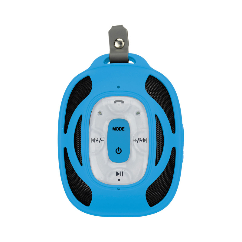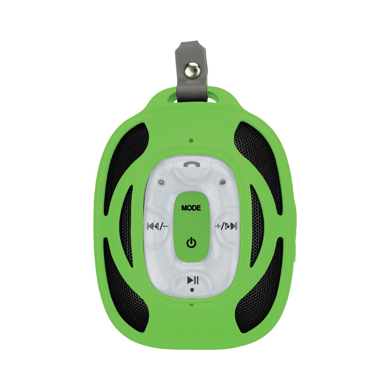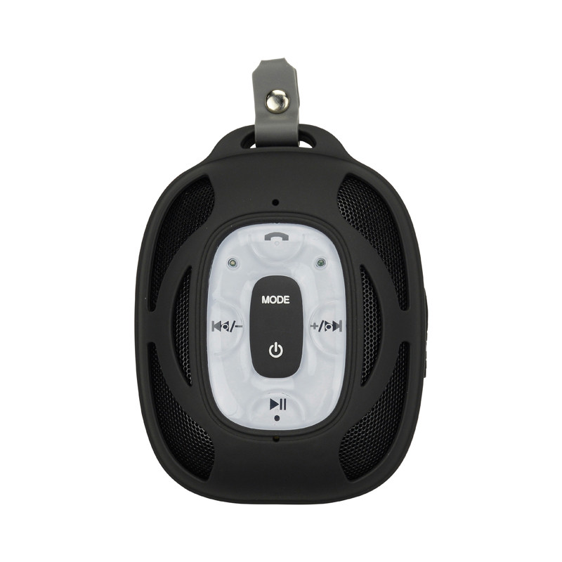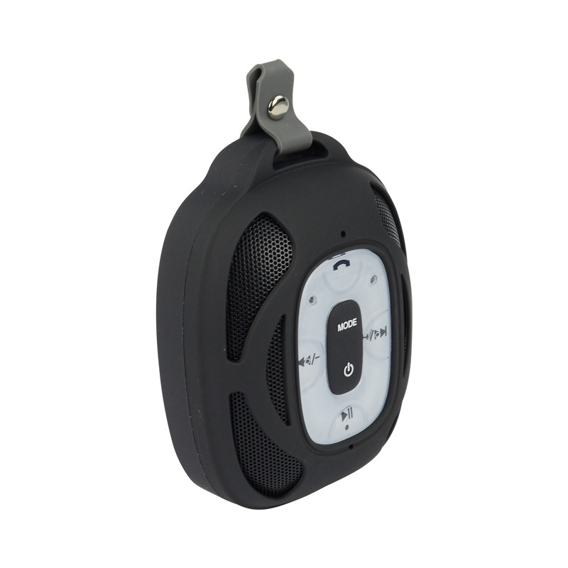 Compact water resistant Bluetooth speaker with silicone jacket and high quality suction cup. Features include; power on/off, vol+/previous, vol-/next, play/pause, answer/hang up and handsfree functionality. Includes USB charge cable and user manual. Specifications: Bluetooth V3.0+EDR, Waterproof class IPX4, Speaker diameter 40 mm, Frequency range 100...